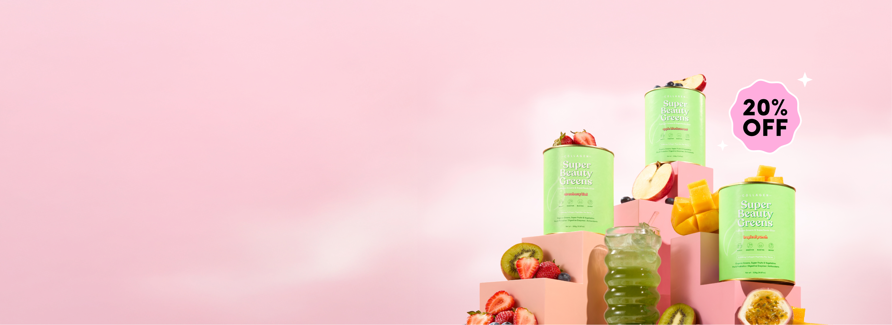 Our collagen greens are fruity and refreshing with NO grassy aftertaste!