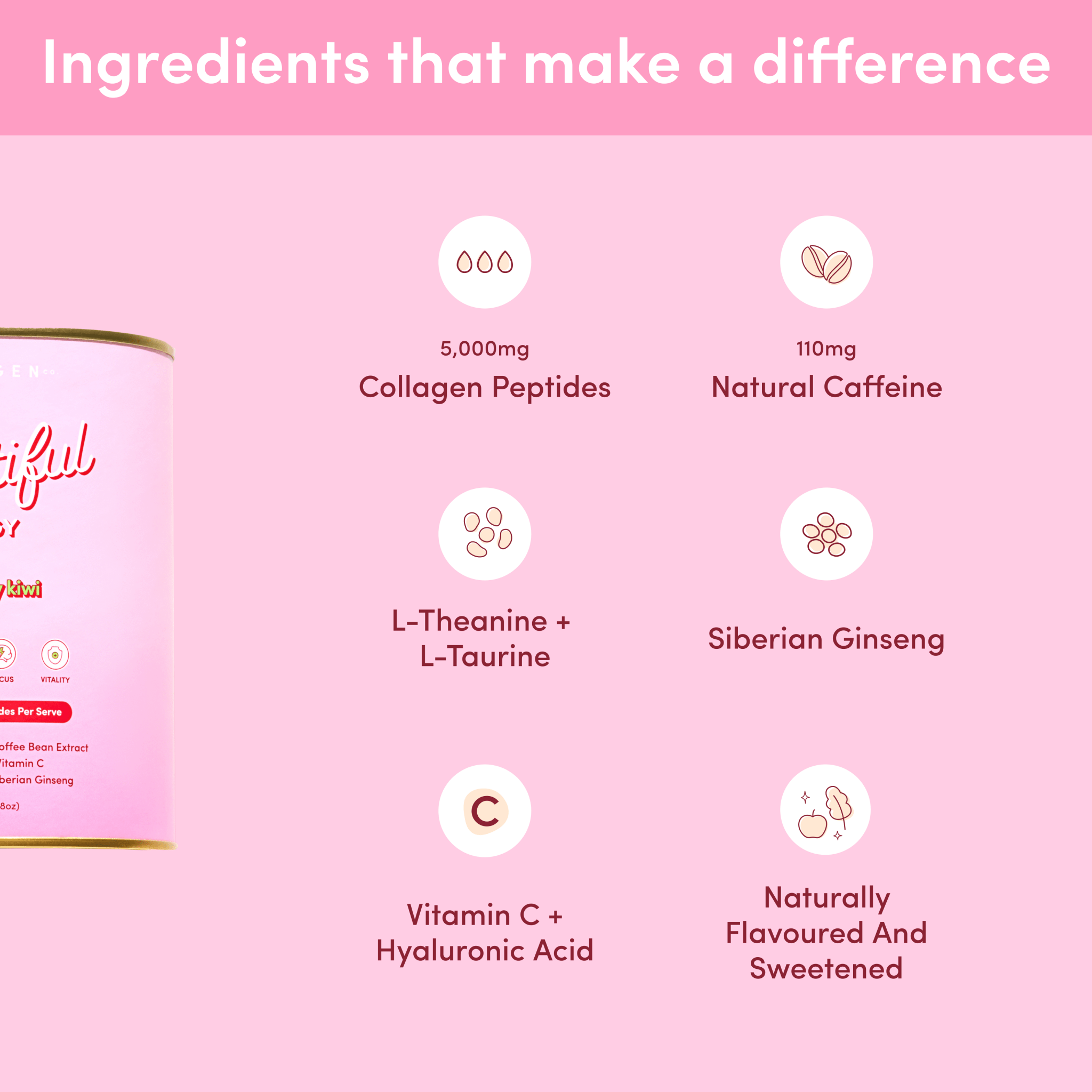 Your all-in-one ritual for energy, recovery, and glow. Start your day with Beautiful Energy, formulated to boost focus and keep you powering through. Support your everyday beauty and wellness with Premium Collagen Peptides (flavour of your choice) — the ultimate daily essential for radiant skin, strong hair and nails, gut balance, and all-round vitality.