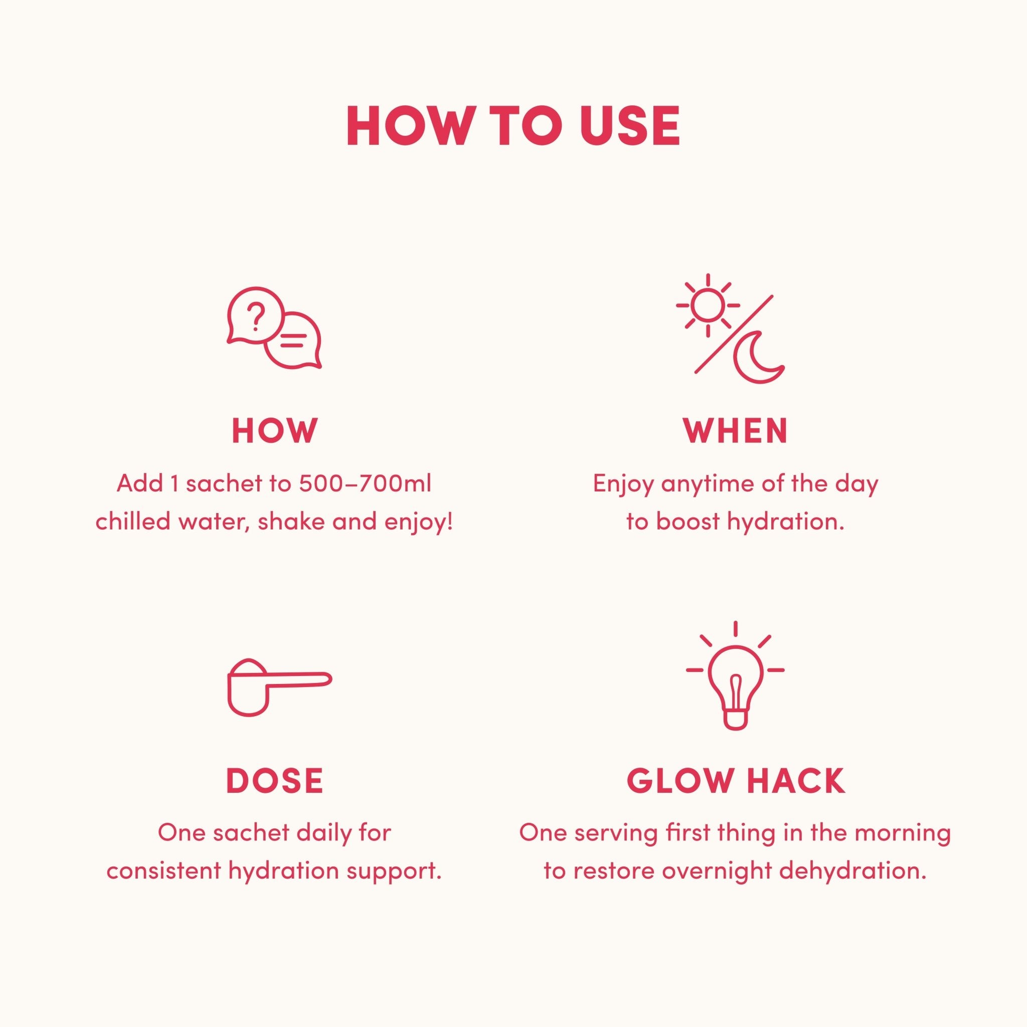 When: One sachet daily is ideal for consistent hydration support. On higher demand days like workouts, heat, or travel, simply reach for an extra serve as needed.
